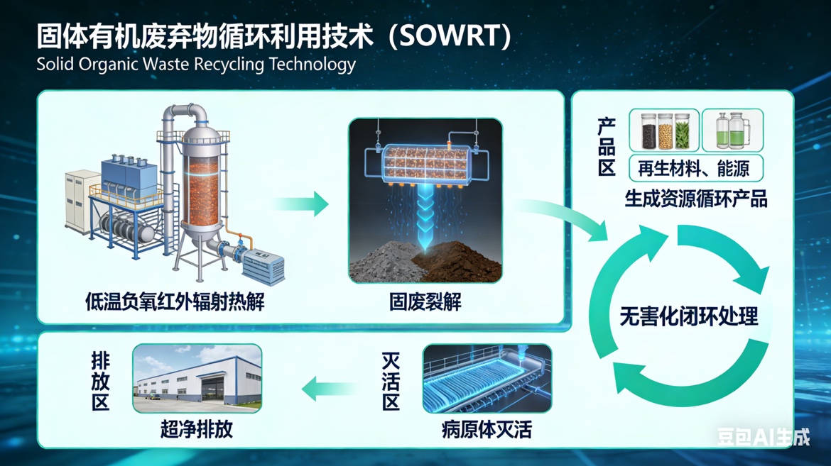 SOWRT,固体有机废弃物循环利用技术(Solid Organic Waste Recycling Technology ),技术采用低温负氧红外辐射热解,实现固废裂解,生成资源循环产品,并保证超净排放、病原体灭活,实现无害化闭环处理